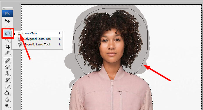 At the last step we learned how to remove background around hair in photoshop, now we add the separated hair to the main selection with Lasso Tool in Photoshop. Simply select the Lasso Tool and draw a line like the following Photo.